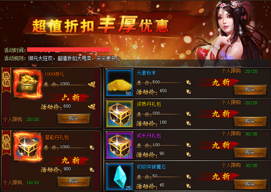 - 绑元大甩卖物品为游戏中稀有物品,都以9折的价格出售,同时每样物品都有限购次数。