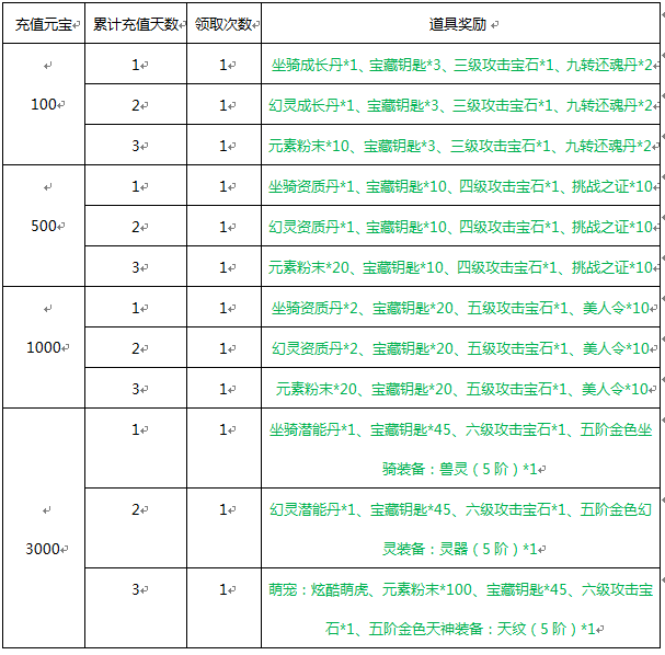1、活动期间,玩家每日充值相应元宝可获好礼。